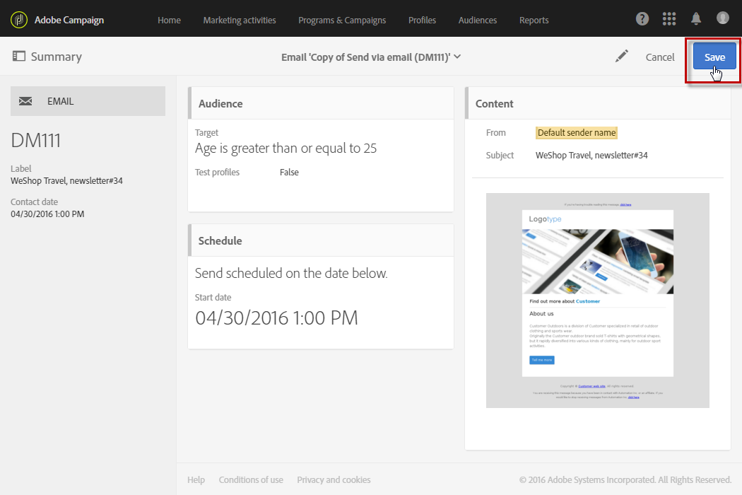 템플릿이 브랜드에 연결되어 있습니다. 이메일 편집기에서 기본 발신자의 이메일 주소, 기본 발신자 이름또는 로고와 같은 요소는 구성된 브랜드 데이터를 사용합니다.