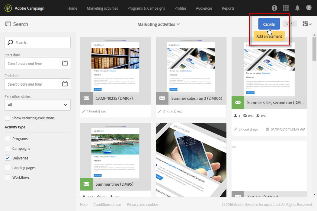 Marketing activities 메뉴에서 Create 버튼을 클릭합니다.