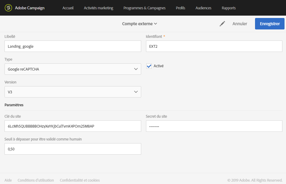 Pour un compte externe Google reCAPTCHA version 3, fournissez les détails suivants :