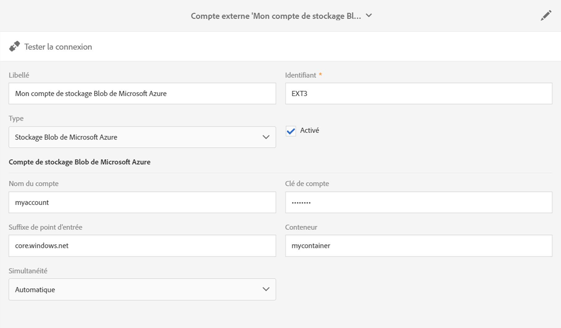 Une fois cette option configurée, cliquez sur Tester la connexion pour lier Adobe Campaign au stockage Blob Microsoft Azure.