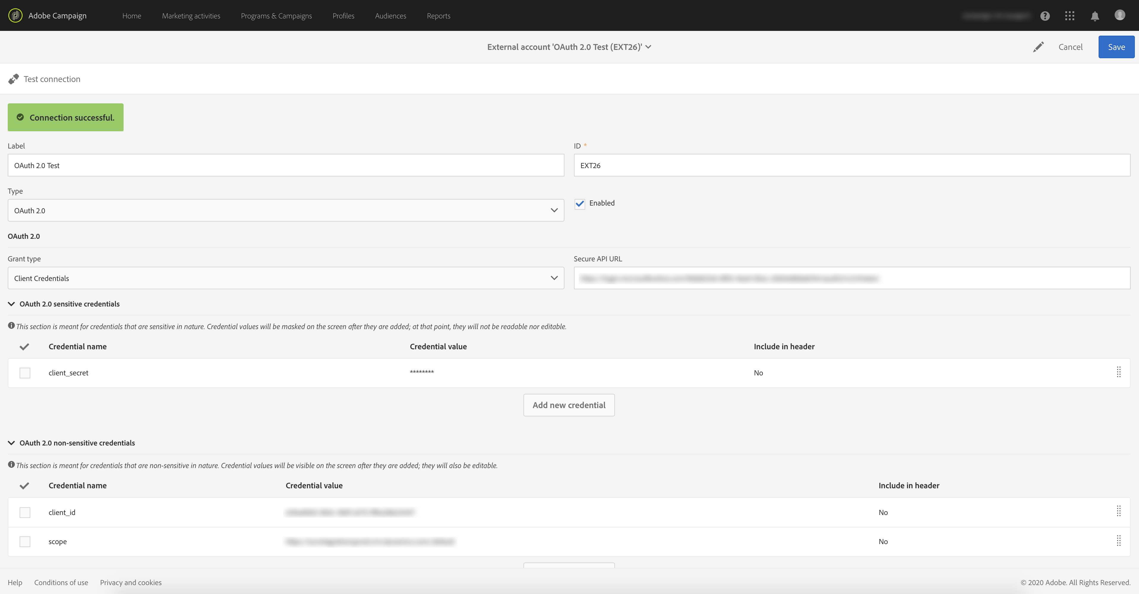 외부 계정은 Adobe Campaign 외부에 있는 서버에 대한 액세스를 구성하고 테스트할 수 있는 구성입니다.