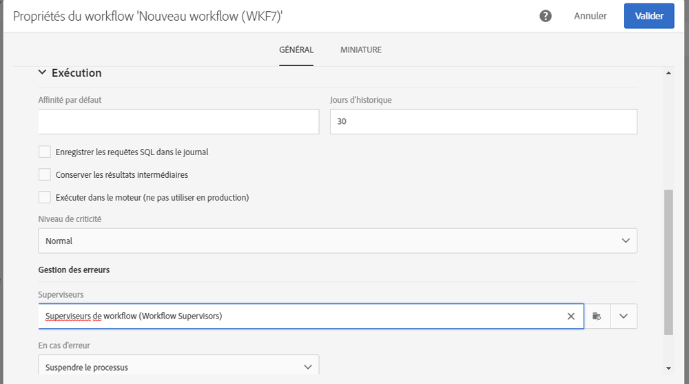 Workflows : chaque membre du groupe de sécurité sélectionné est informé (par email et notification In-App) en cas d’erreur dans un workflow. Un clic sur la notification ou sur le lien de l'email affiche le workflow correspondant. Les notifications sont désactivées par défaut dans le modèle d'usine de workflow. Si vous souhaitez les activer, éditez les propriétés du workflow ou du modèle de workflow et ajoutez un groupe de sécurité sous Général > Exécution > Gestion des erreurs > Superviseurs. Pour plus d'informations sur les groupes de sécurité, voir Gestion des groupes et des utilisateurs. Pour plus d'informations sur les propriétés d'un workflow, voir Propriétés d'un workflow.
