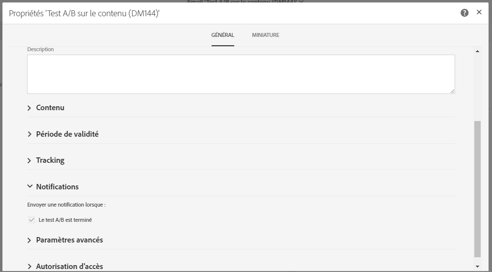 Emails de test A/B : le créateur de l'email et la ou les personnes qui le modifient sont informés qu'une variante a été sélectionnée (mode automatique) ou qu'une variante doit être sélectionnée (mode manuel). Un clic sur la notification affiche l'email correspondant. Les notifications sont activées par défaut dans le modèle d'usine Test A/B. Si vous souhaitez les désactiver, éditez les propriétés de l'email ou du modèle d'email et décochez la case située sous Général > Notifications. Pour plus d'informations sur les emails de test A/B, voir Créer un test A/B. Pour plus d'informations sur les propriétés d'un email, voir Liste des propriétés des emails.