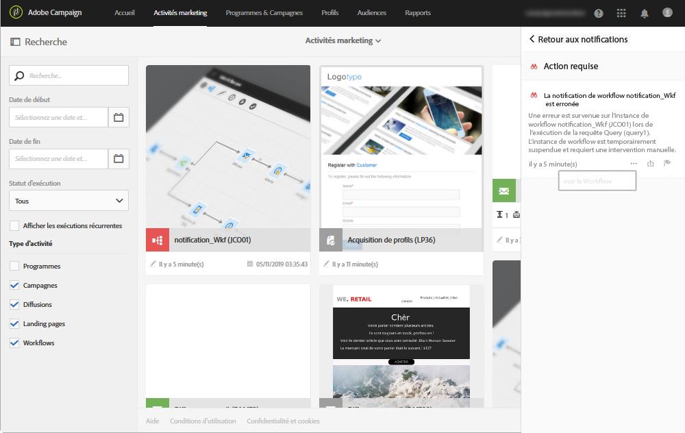 Adobe Campaign vous permet de recevoir directement dans l'application des notifications concernant des activités système importantes. Les notifications en temps réel maintiennent les parties concernées informées et permettent aux utilisateurs d’agir immédiatement et directement dans l’application en fonction des notifications d’activité. Pour les équipes, il en résulte une meilleure agilité, une plus grande efficacité et une exécution des campagnes sans accrocs.