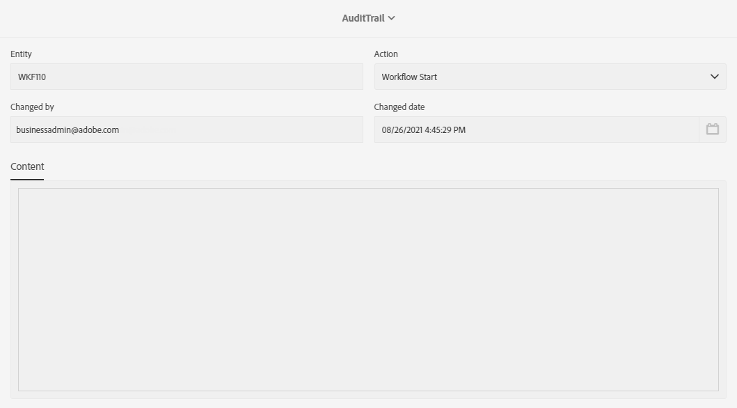 엔터티 목록과 함께 Audit trail 창이 열립니다. Adobe Campaign Standard은 워크플로우, 옵션 및 사용자 지정 리소스에 대한 만들기, 편집 및 삭제 작업을 감사하게 됩니다.