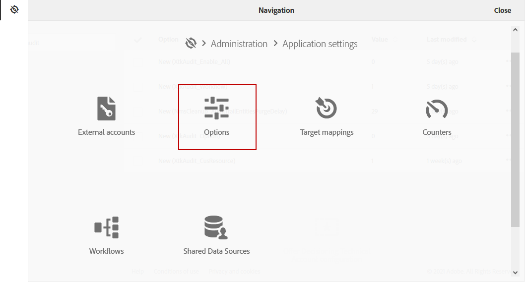 Adobe Campaign Standard의 고급 메뉴에서 Administration > Application settings > Options을(를) 선택합니다.