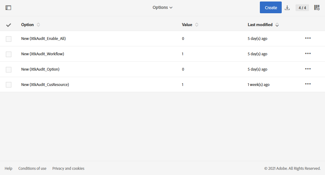 옵션에 대한 감사 추적을 관리하는 XtkAudit_Option 옵션입니다.