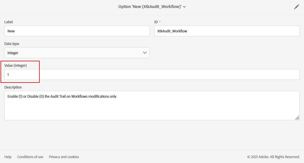워크플로우에 대한 감사 추적을 관리하는 XtkAudit_Workflows 옵션입니다.