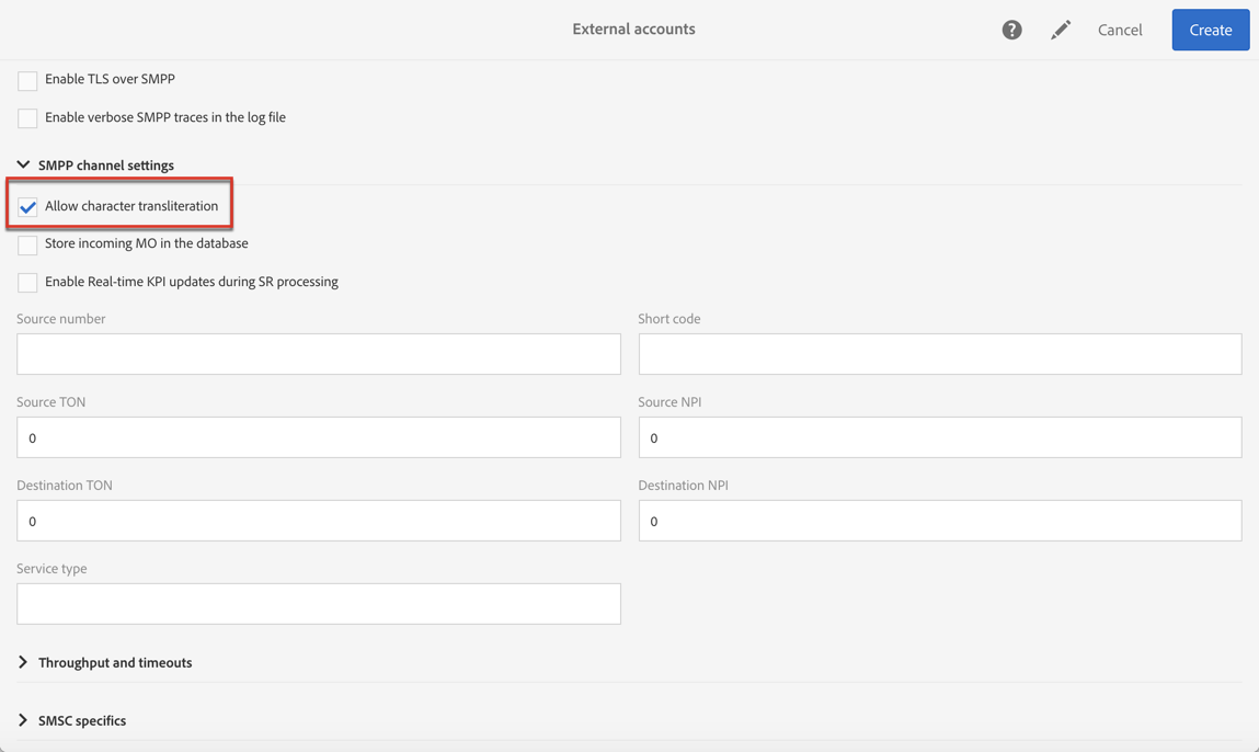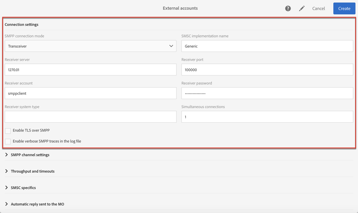 SMPP 프로토콜을 사용하려면 새 외부 계정을 만들 수도 있습니다. SMS 프로토콜 및 설정에 대한 자세한 내용은 이 기술 정보를 참조하십시오.