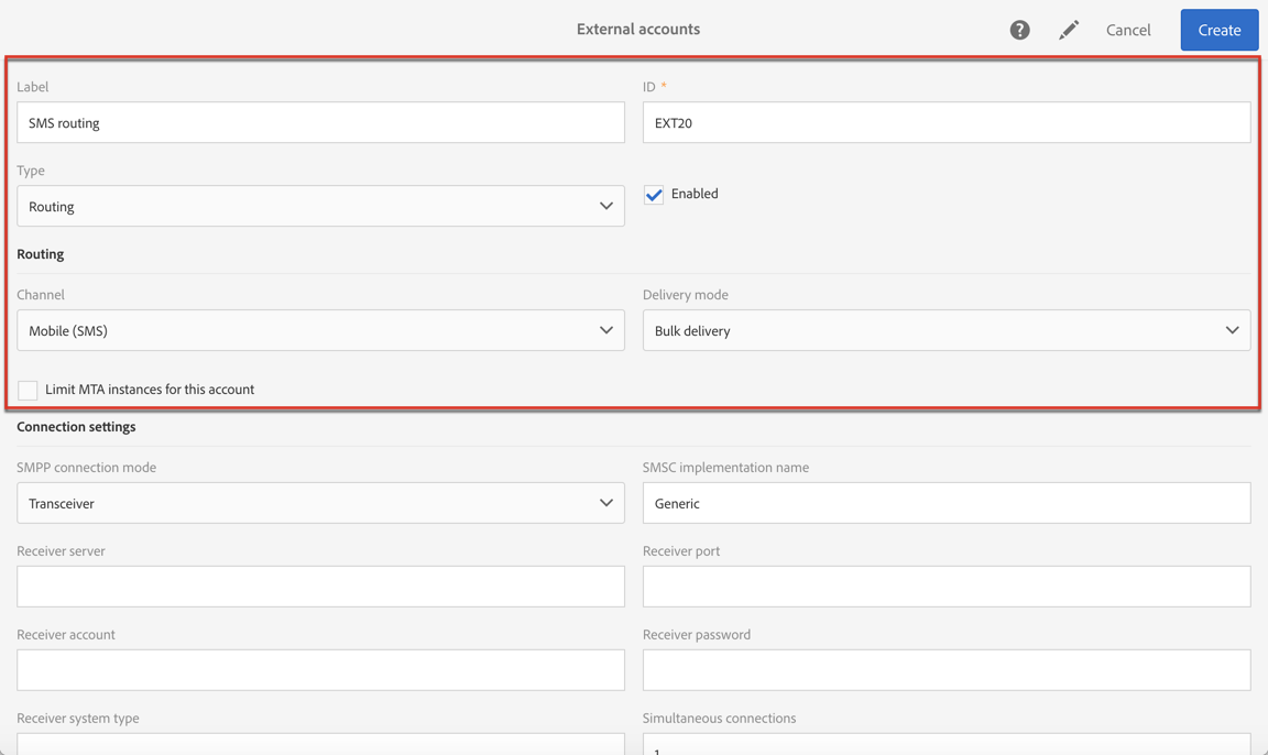 계정 유형은 Routing, 채널은 Mobile (SMS), 게재 모드는 Bulk delivery(으)로 정의합니다.