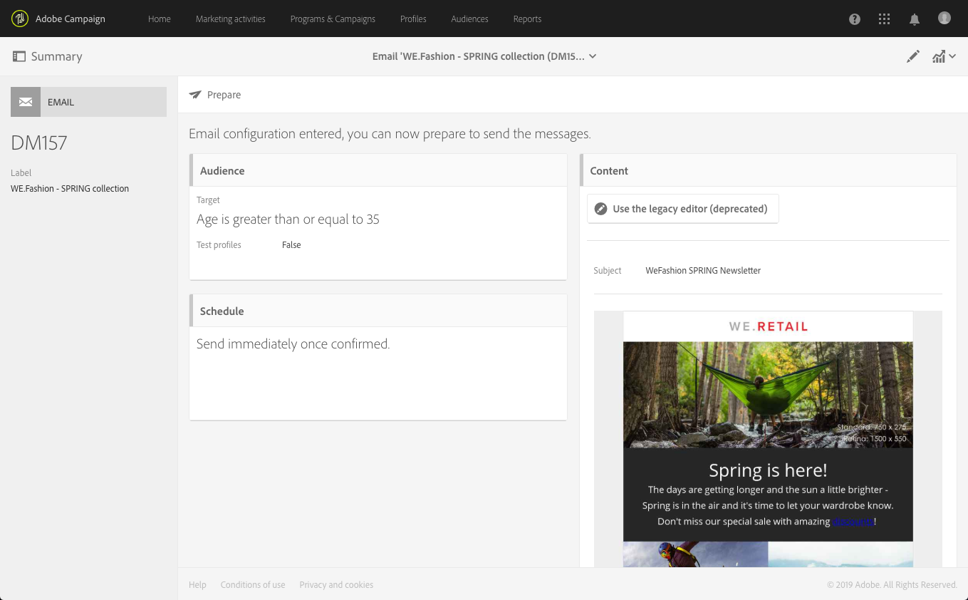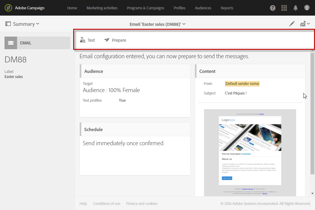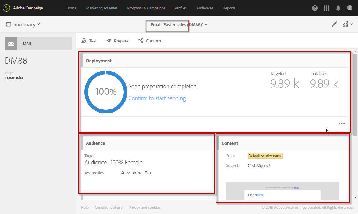 Prepare send: 전송 준비를 시작합니다. 다음 Deployment 블록이 나타나고 준비 결과를 표시합니다. 이 단추는 대상이 입력된 경우에만 나타납니다. 언제든지 해당 버튼을 사용하여 준비를 중단할 수 있습니다. 메시지 준비에 대한 자세한 내용은 보내기 준비.