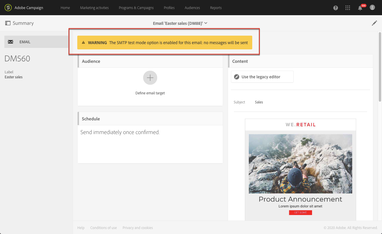 Send a test: 사용할 승인 모드를 선택할 수 있습니다. Email rendering (이메일 전용), Proof 또는 둘 다 사용할 수 있습니다. 테스트 프로필에 대한 자세한 내용은 증명 보내기. 이 단추는 테스트 프로필을 만든 후에만 활성화됩니다.