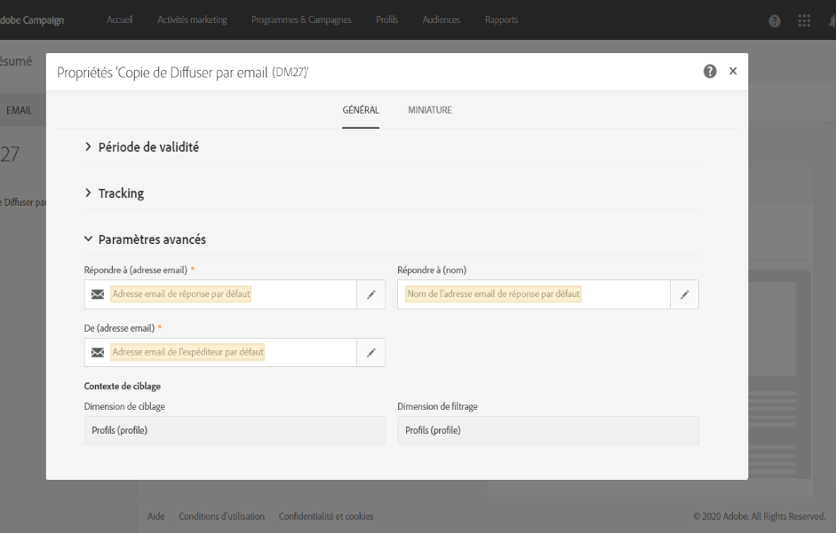 Conseil : Adobe recommande d'utiliser une adresse réelle existante comme l'Assistance clientèle de votre marque. Ainsi, si un destinataire envoie une réponse, l'Assistance clientèle sera en mesure de la traiter.