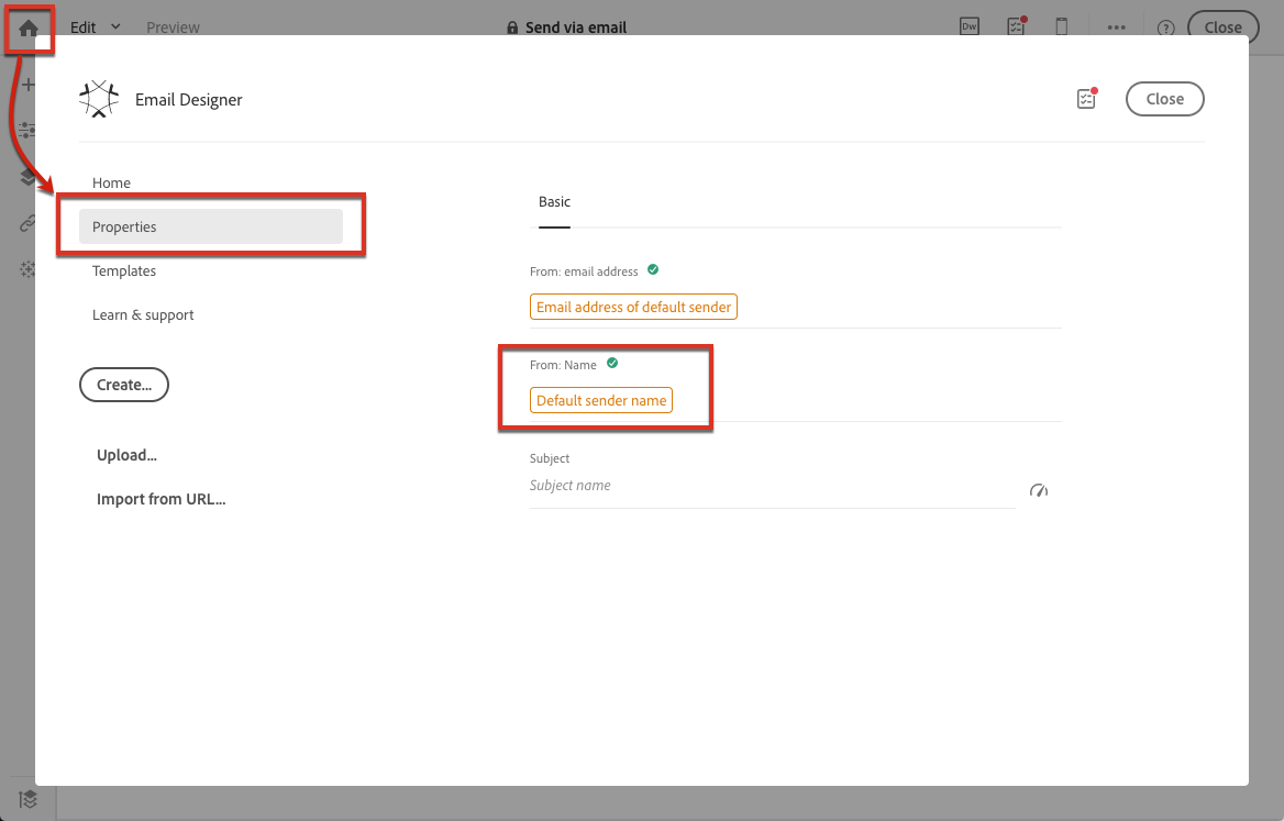 보낸 메시지 헤더에 표시될 발신자의 이름을 변경하려면 Properties 이메일 디자이너 홈 페이지(홈 아이콘을 통해 액세스 가능)의 탭을 클릭하고 Default sender name 차단.