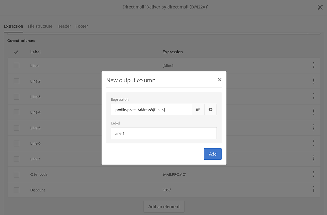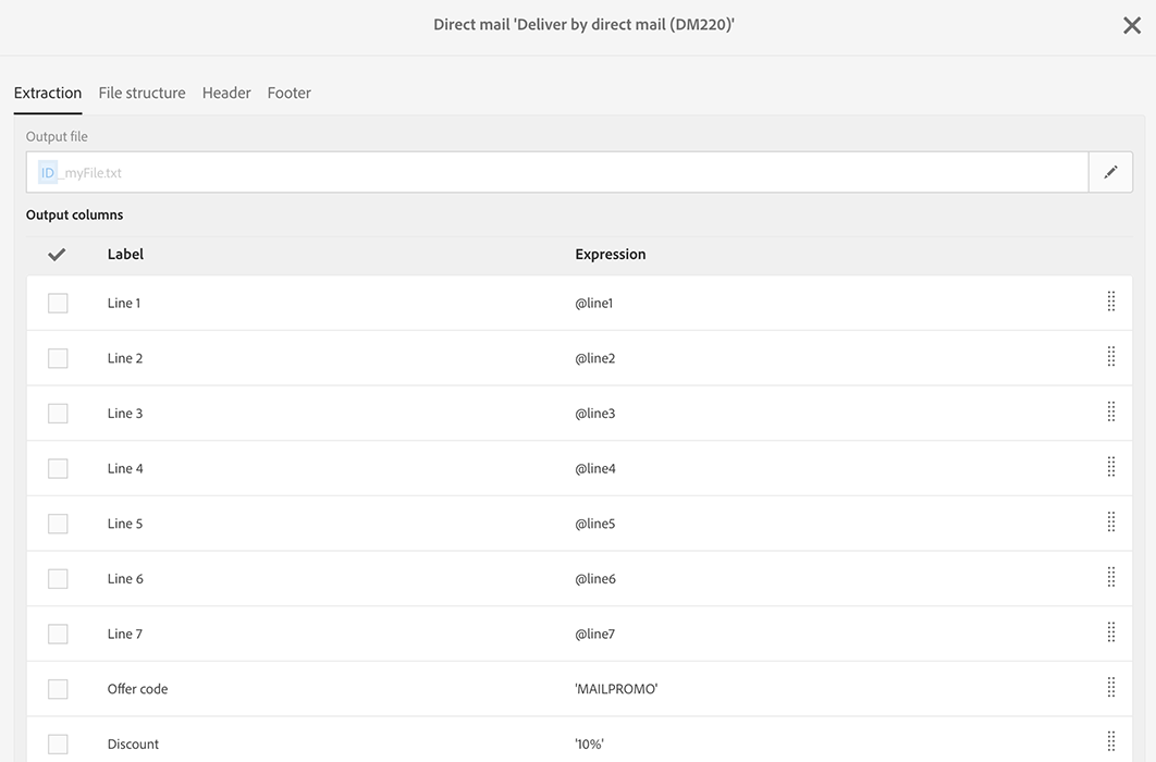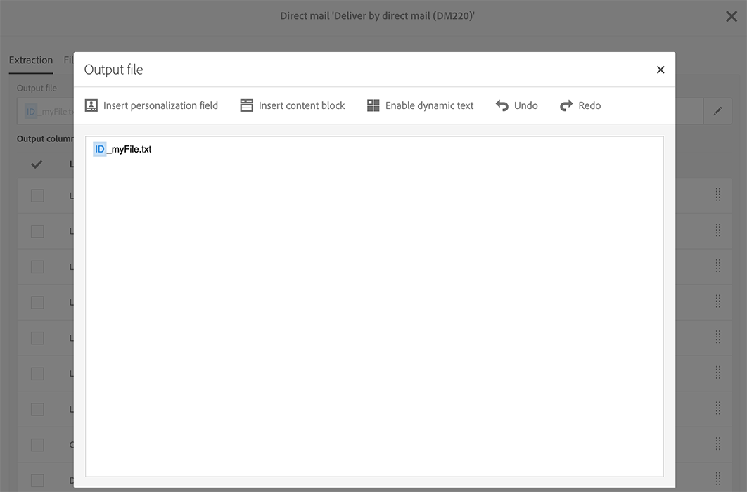 먼저 추출 파일의 이름을 정의합니다. Output file 필드 오른쪽의 버튼을 클릭하고 원하는 레이블을 입력합니다. 개인화 필드, 콘텐츠 블록 및 다이내믹 텍스트를 사용할 수 있습니다(콘텐츠 정의 참조). 예를 들어 게재 ID 또는 추출 날짜로 레이블을 만들 수 있습니다.
