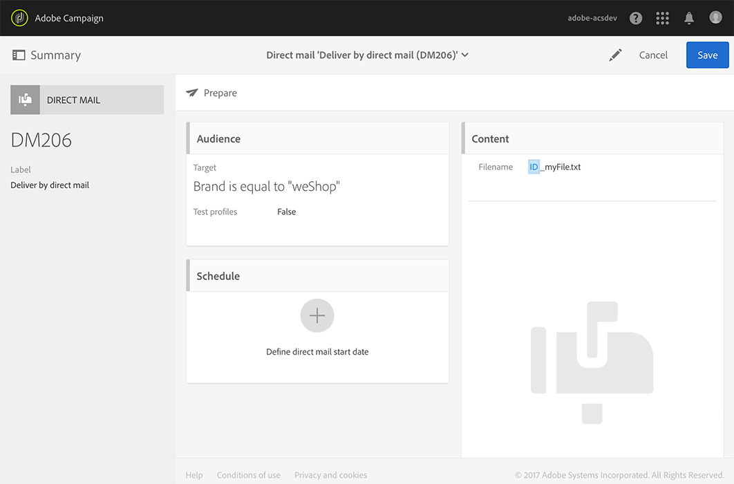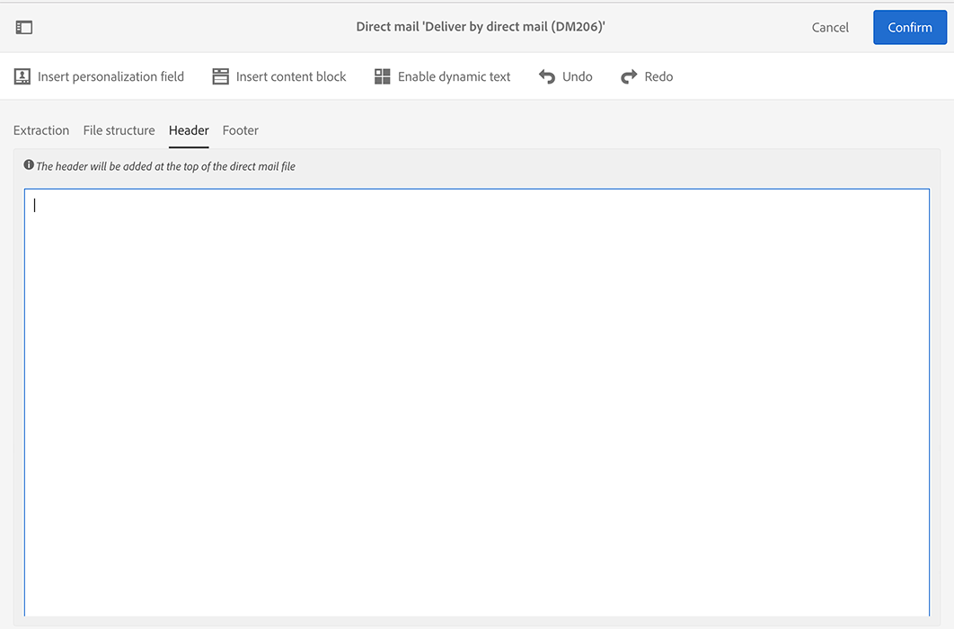 예를 들어, DM 공급자의 경우 파일 머리글에 발신자 정보를 포함하고 싶을 수 있습니다. 게재 컨텍스트에서 사용 가능한 정보로 바닥글과 머리글을 개인화할 수 있습니다. 콘텐츠 정의를 참조하십시오.
