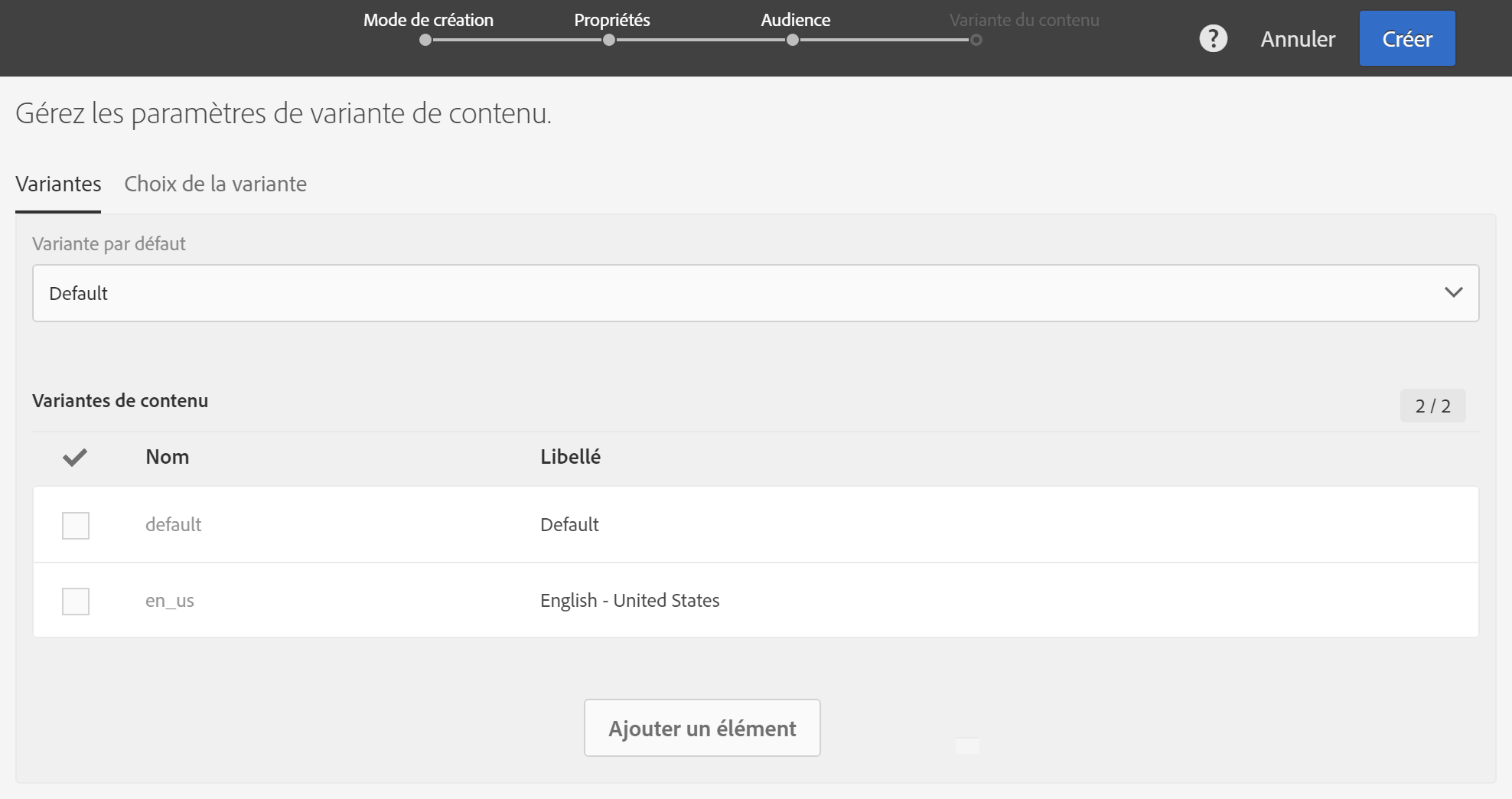 Au besoin, ajoutez des variantes à l'aide du bouton Ajouter un élément. La variante Par défaut ne doit pas être supprimée. Lorsqu'elle est définie sur la valeur Par défaut, la langue préférée du profil est utilisée pour sélectionner la variante. Vous pouvez également définir la variante Par défaut sur n'importe quelle autre langue.