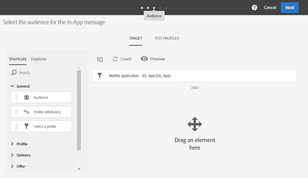 인앱 메시지에 대해 타겟팅할 대상자를 선택합니다. 대상자는 이 게재와 연결된 모바일 애플리케이션에 따라 미리 필터링됩니다.