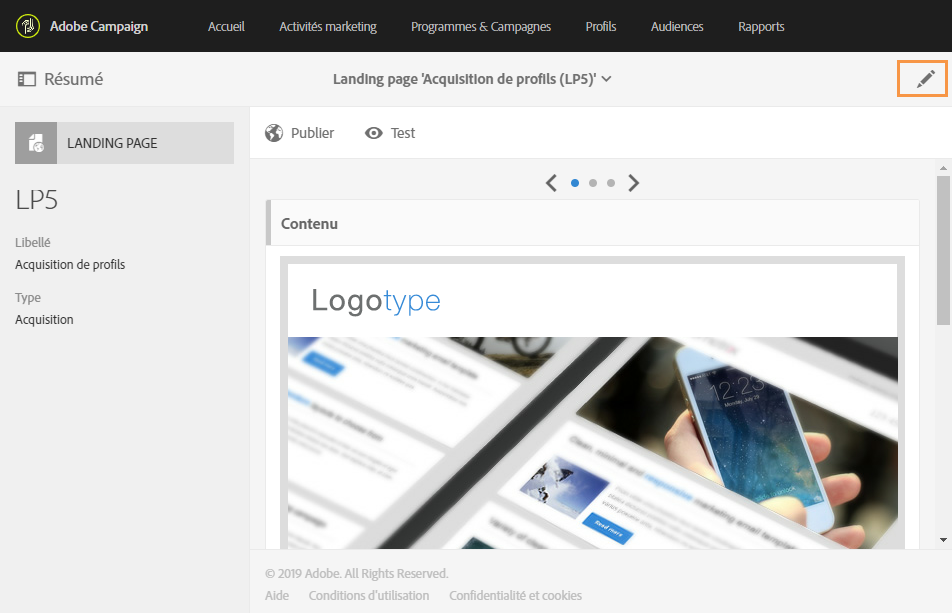 Editez les propriétés de la landing page accessibles via l'icône