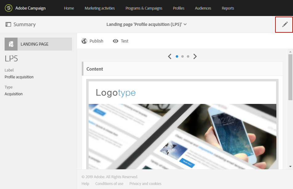 Edit properties 아이콘을 통해 랜딩 페이지 속성에 액세스합니다.