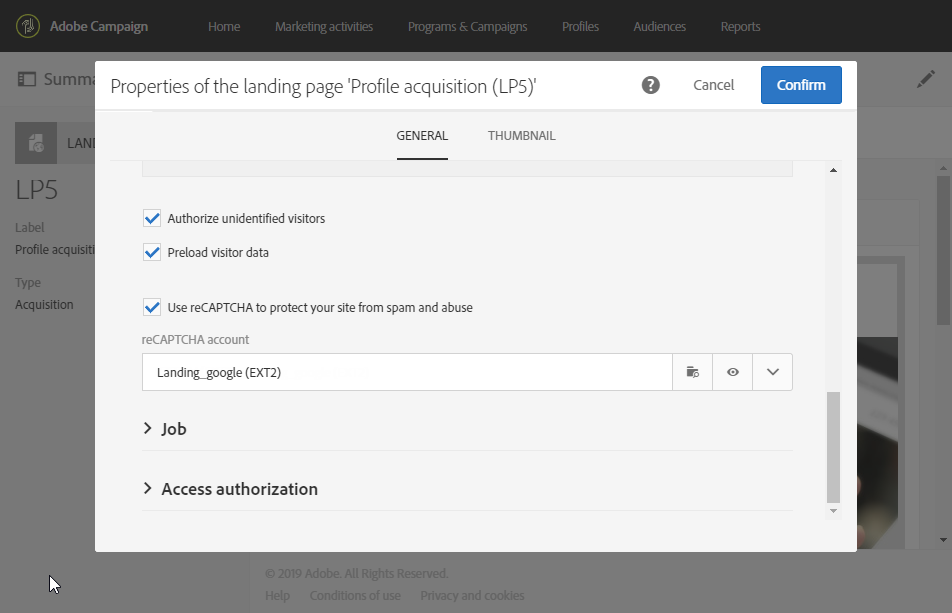 랜딩 페이지에 Google reCAPTCHA V3를 설정하여 봇에 의한 스팸 및 남용을 방지할 수 있습니다. 랜딩 페이지에서 사용하려면 먼저 외부 계정을 만들어야 합니다. 구성 방법에 대한 자세한 내용은 이 섹션을 참조하십시오.