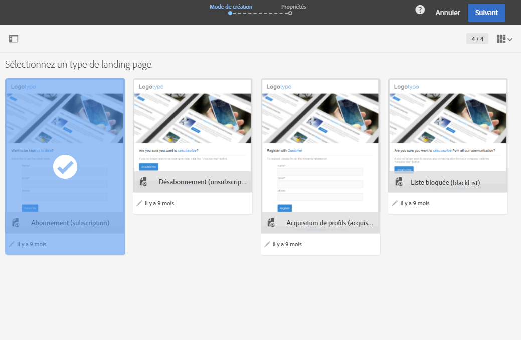 Ces modèles sont proposés par défaut lors de la création d'une nouvelle landing page.