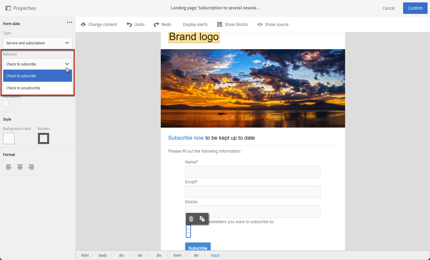 랜딩 페이지에서 확인란 유형 사용에 대한 자세한 내용은 여러 서비스 구독 업데이트 및 계약 확인란 섹션에 자세히 설명되어 있습니다.
