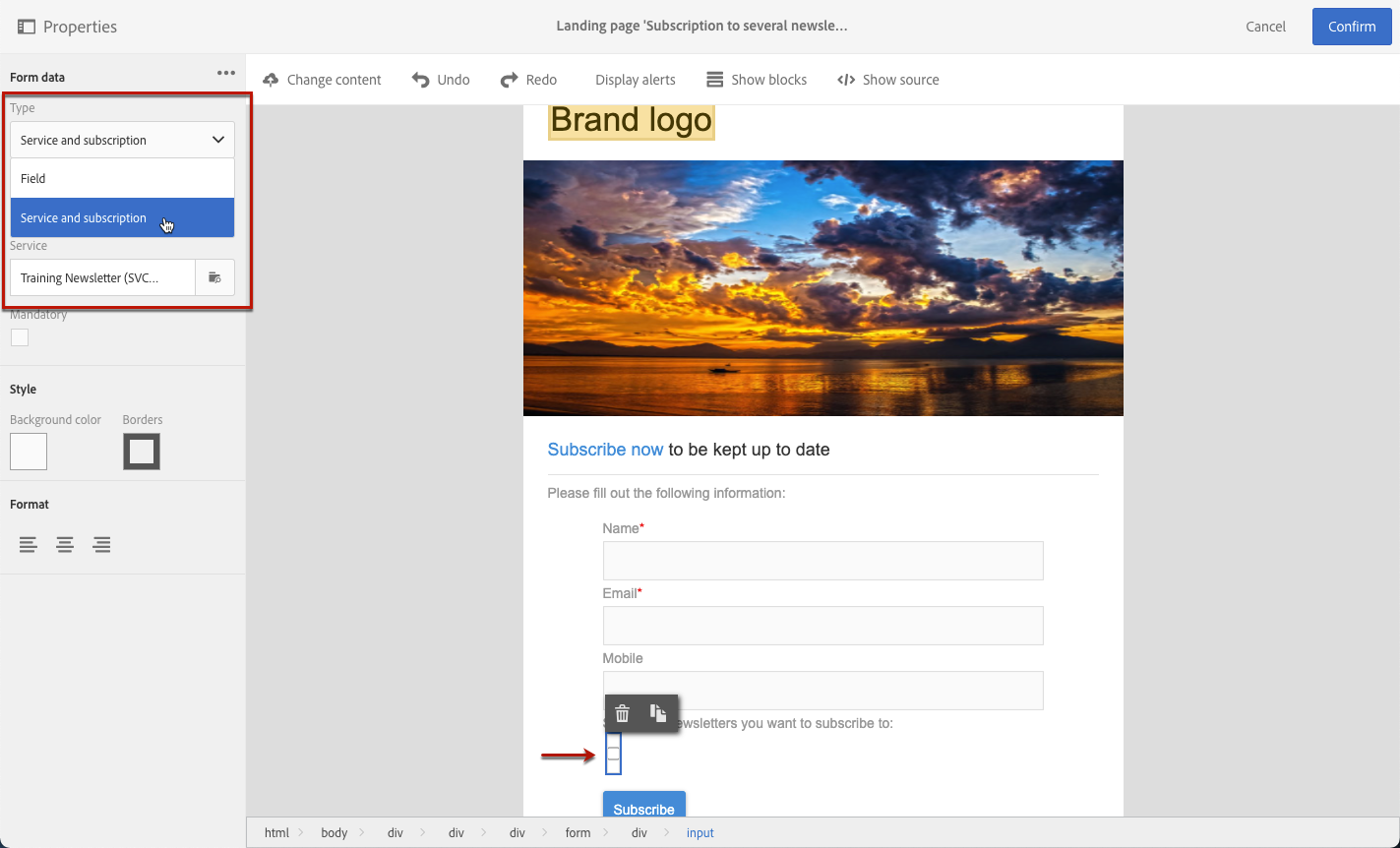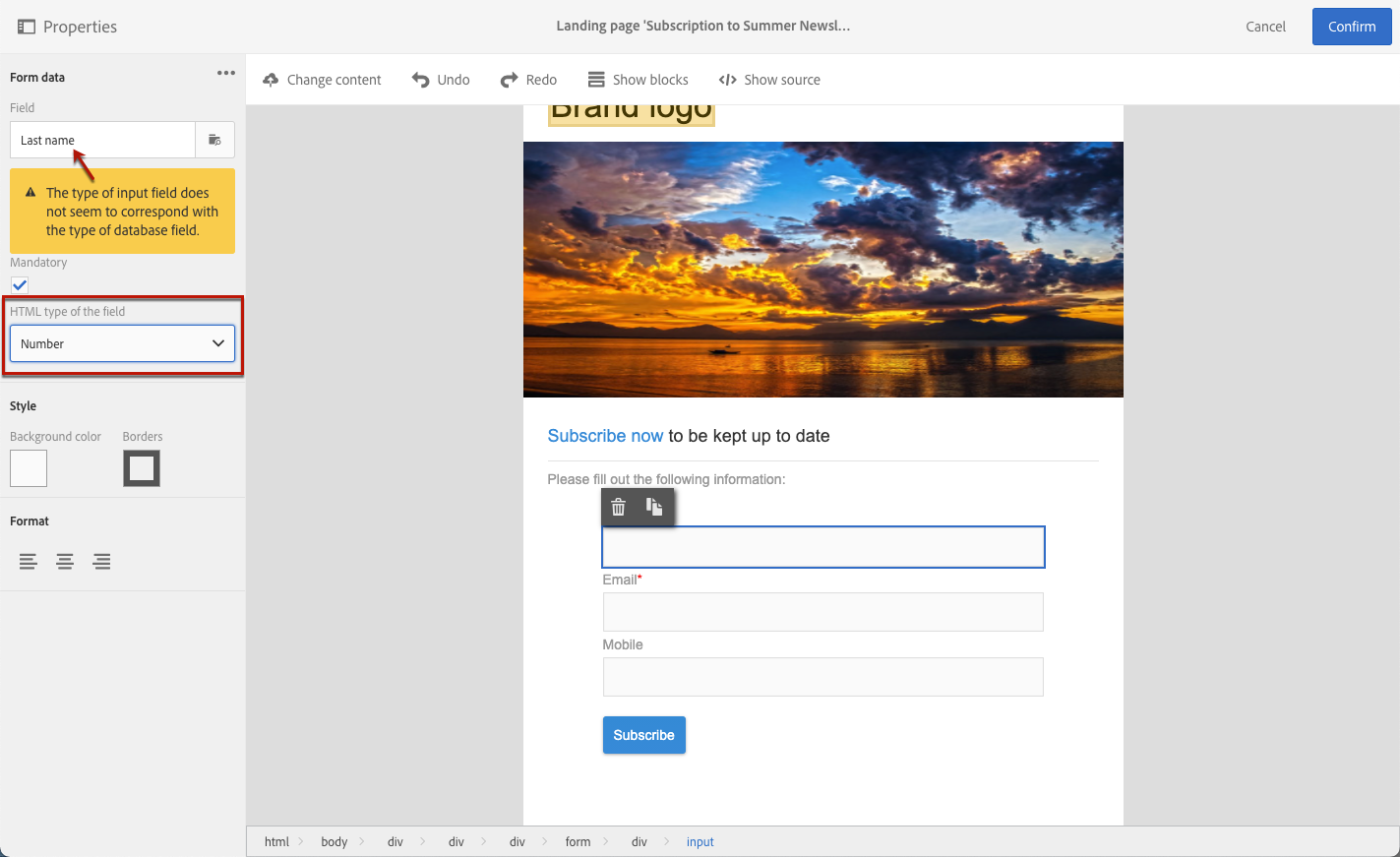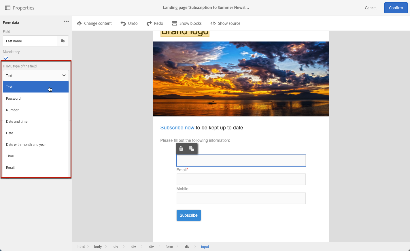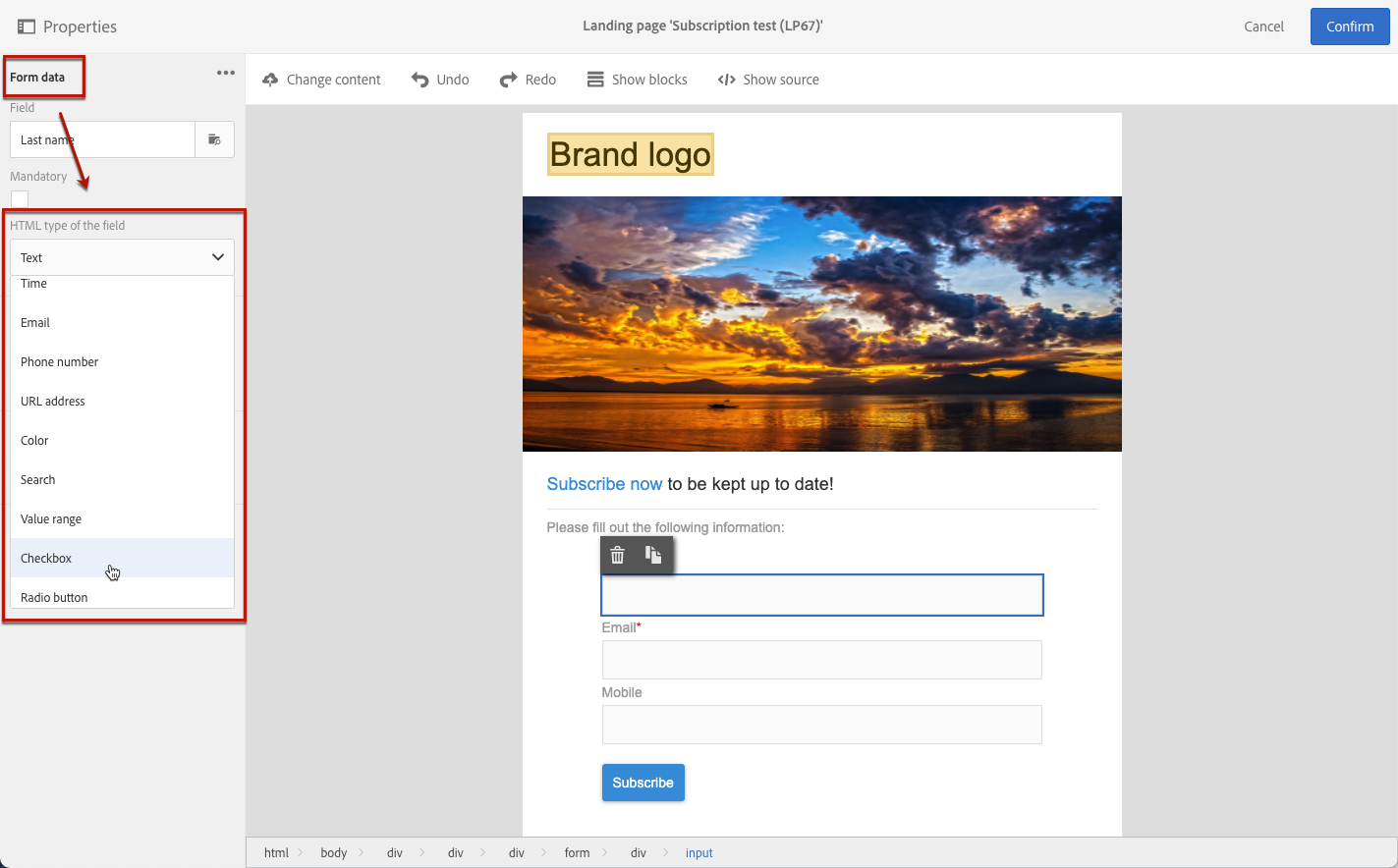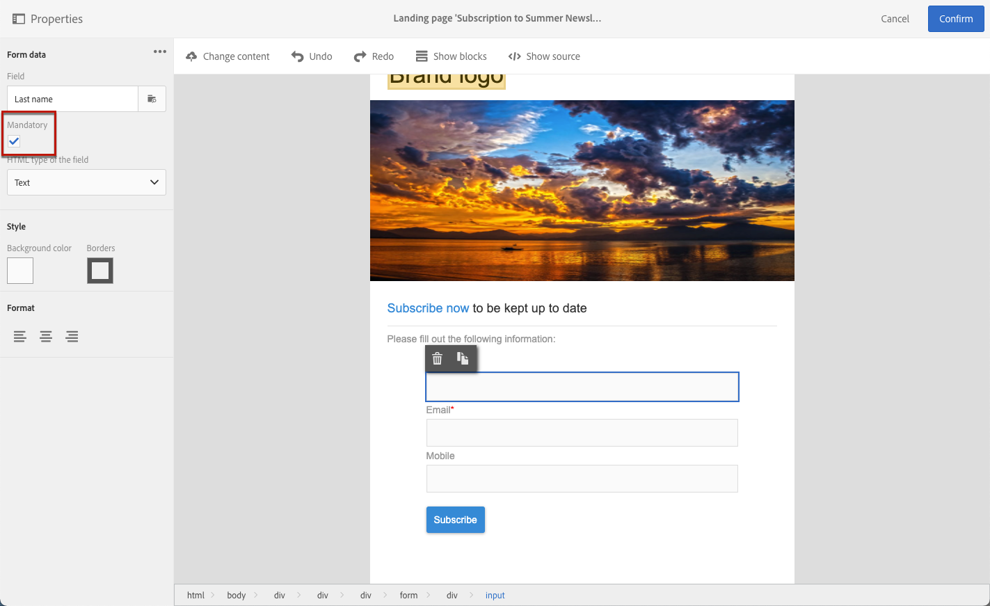 필요한 경우 Mandatory 옵션을 선택합니다. 이 경우 랜딩 페이지는 사용자가 이 필드를 입력한 경우에만 제출할 수 있습니다.