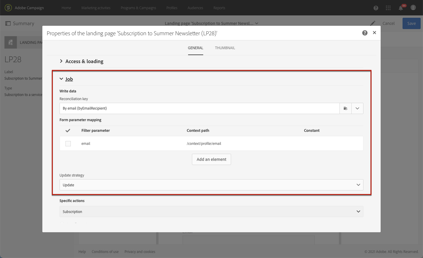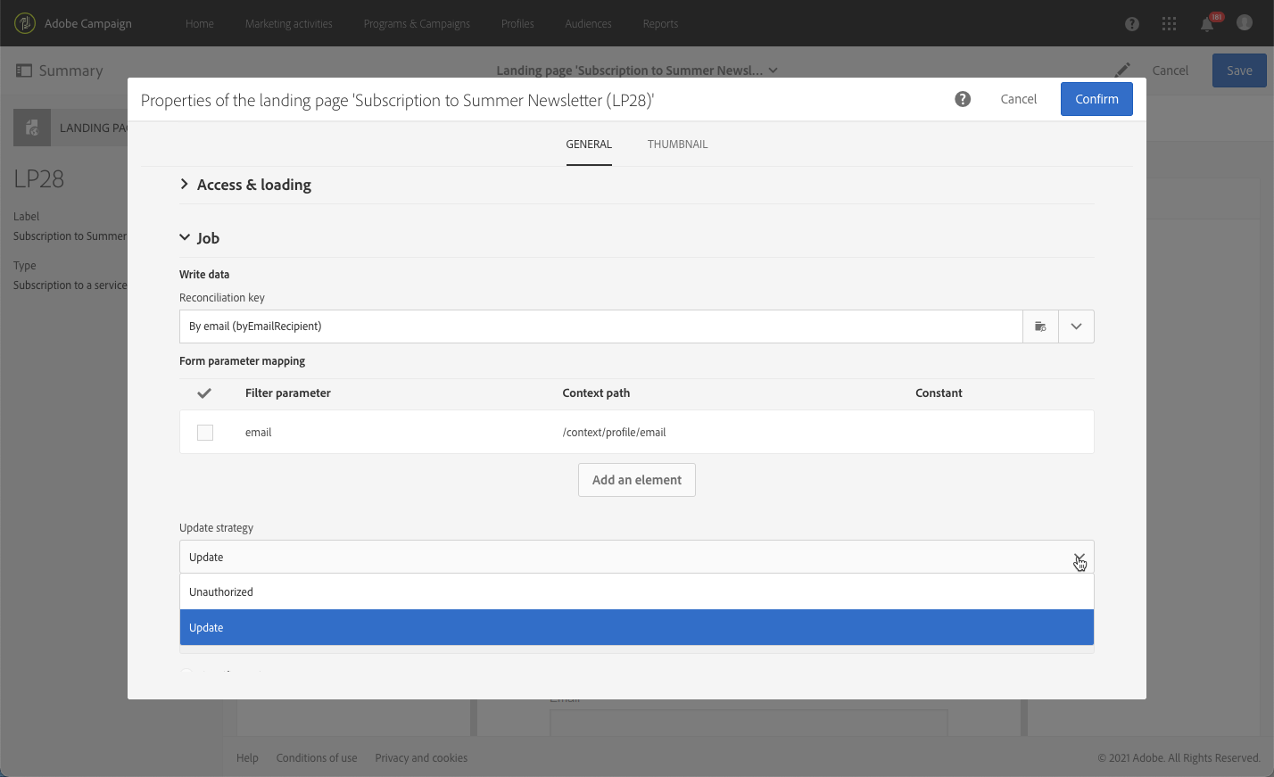 을(를) 선택합니다 Reconciliation key: 이 데이터베이스 필드는 방문자에게 Adobe Campaign 데이터베이스에 이미 알려진 프로필이 있는지 여부를 확인하는 데 사용됩니다. 예를 들어 이메일, 이름, 성 등이 있을 수 있습니다. 조정 키를 사용하면 Update strategy 아래에 정의된 매개 변수입니다.