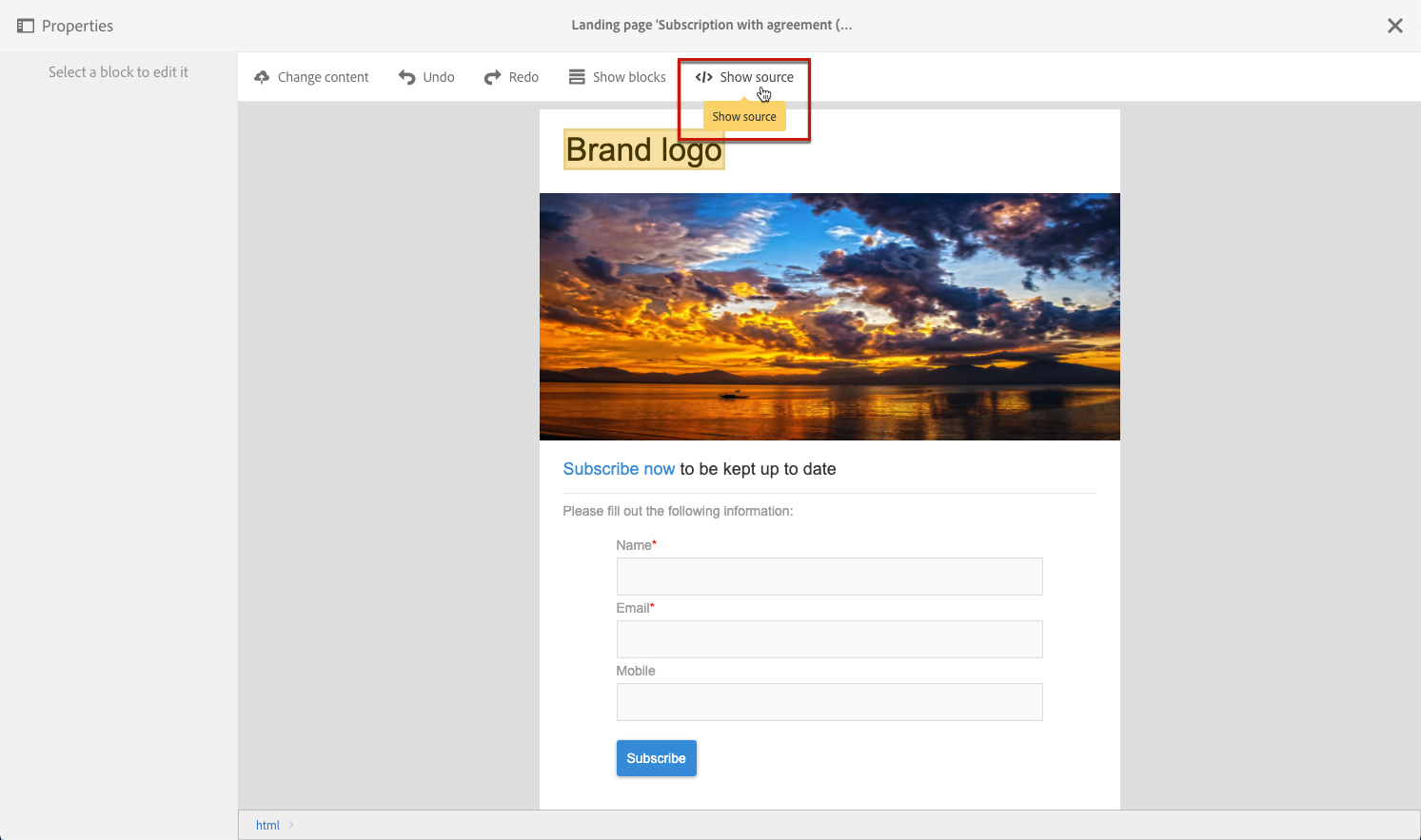 HTML에 익숙한 경우 Show source 버튼을 클릭합니다.