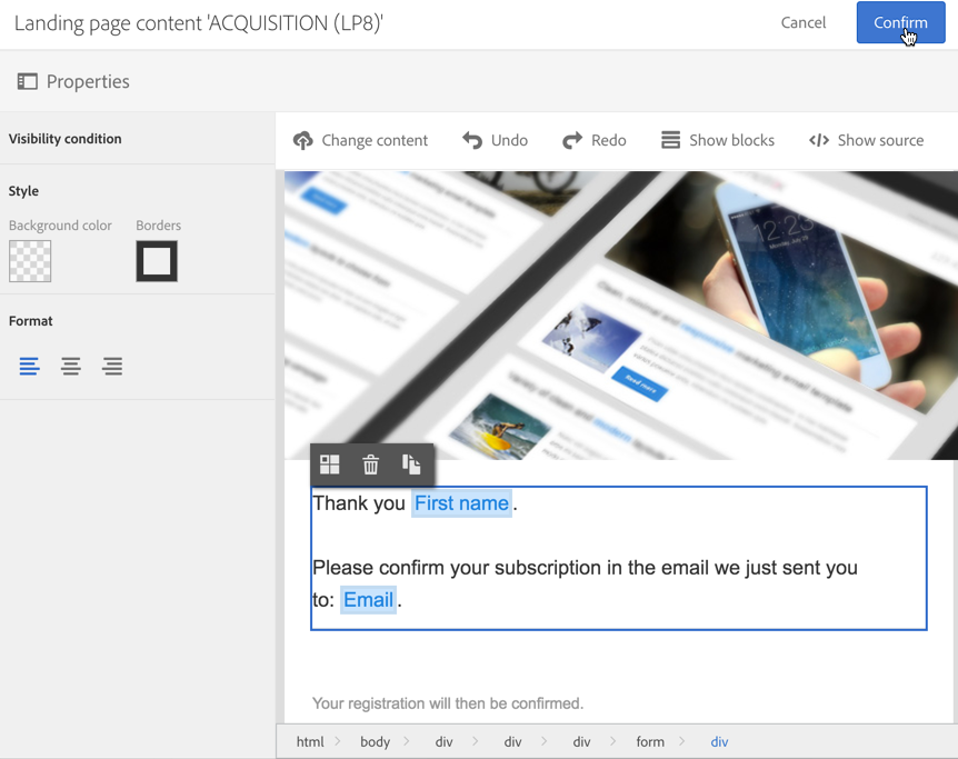 Profile acquisition (acquisition) 템플릿을 기반으로 새 랜딩 페이지를 디자인합니다. 'CONFIRMATION' 레이블을 입력합니다.