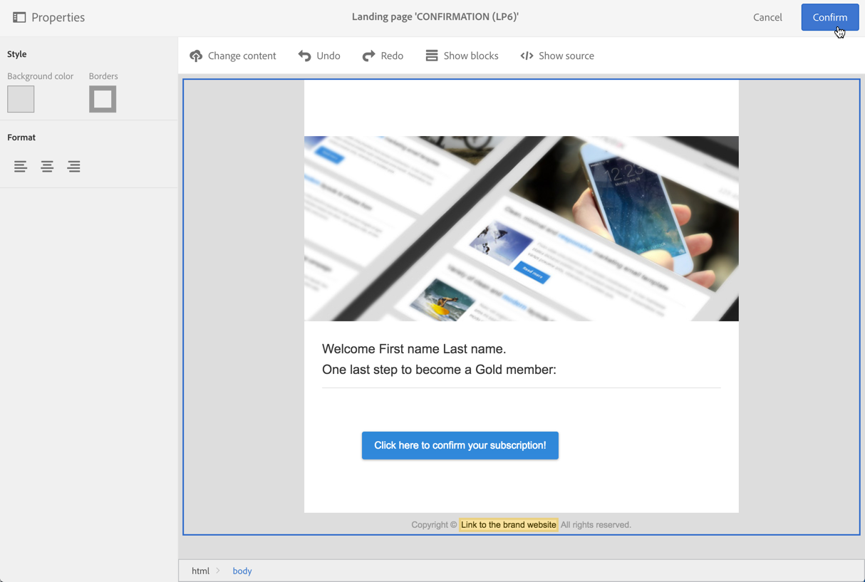 랜딩 페이지의 콘텐츠를 사용자 지정합니다. 예를 들어 개인화된 데이터를 표시하고 확인 버튼의 레이블을 '여기를 클릭하여 내 구독 확인'으로 변경할 수 있습니다.