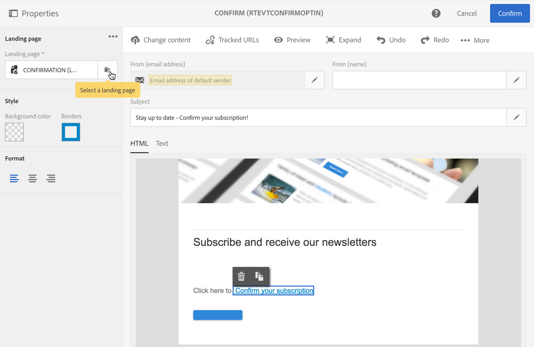 CONFIRMATION 랜딩 페이지에 링크를 추가하고 Confirm을(를) 클릭하여 수정 내용을 저장합니다.