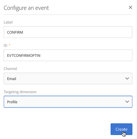 Adobe Campaign 로고에서 액세스할 수 있는 Marketing plans > Transactional messages > Event configuration 메뉴에서 이벤트를 만들고 'CONFIRM' 레이블을 입력합니다.