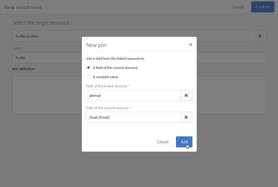 Enrichment 섹션에서 Create element을(를) 클릭하고 Profile 타겟 리소스를 선택합니다. 그런 다음 필요에 따라 email 섹션의 Join definition 필드 또는 기타 복합 조정 키에 매핑할 수 있습니다.