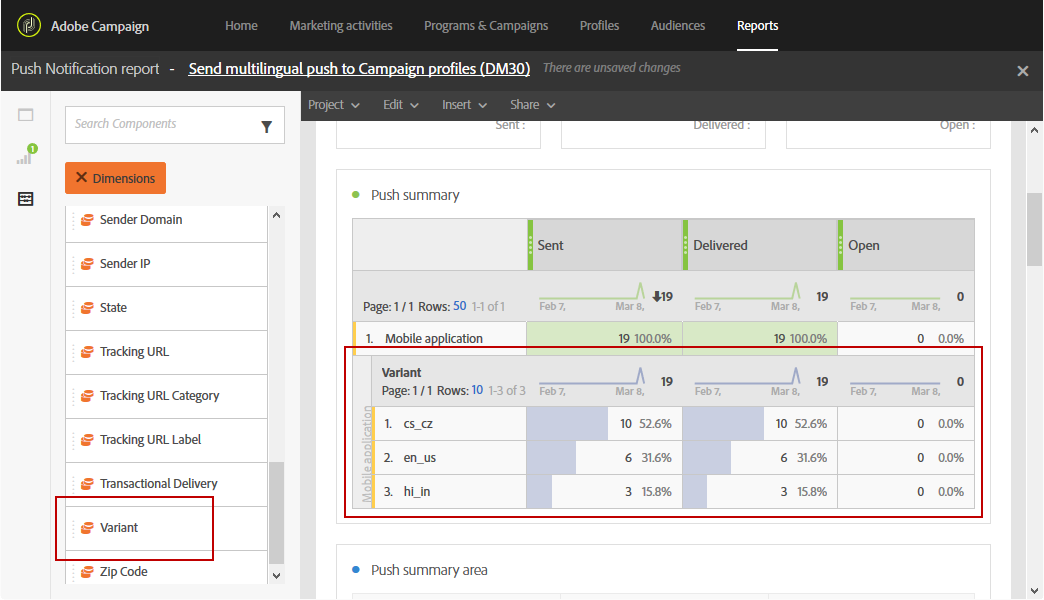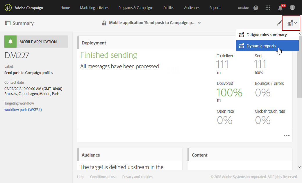 푸시 알림을 성공적으로 전송한 후 Reports 아이콘 다음에 아이콘을 아이콘 Dynamic reports 게재의 성공을 분석하기 위해.