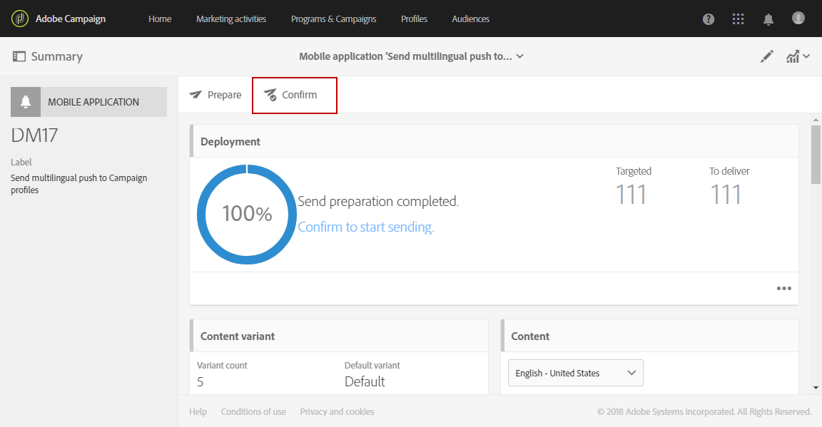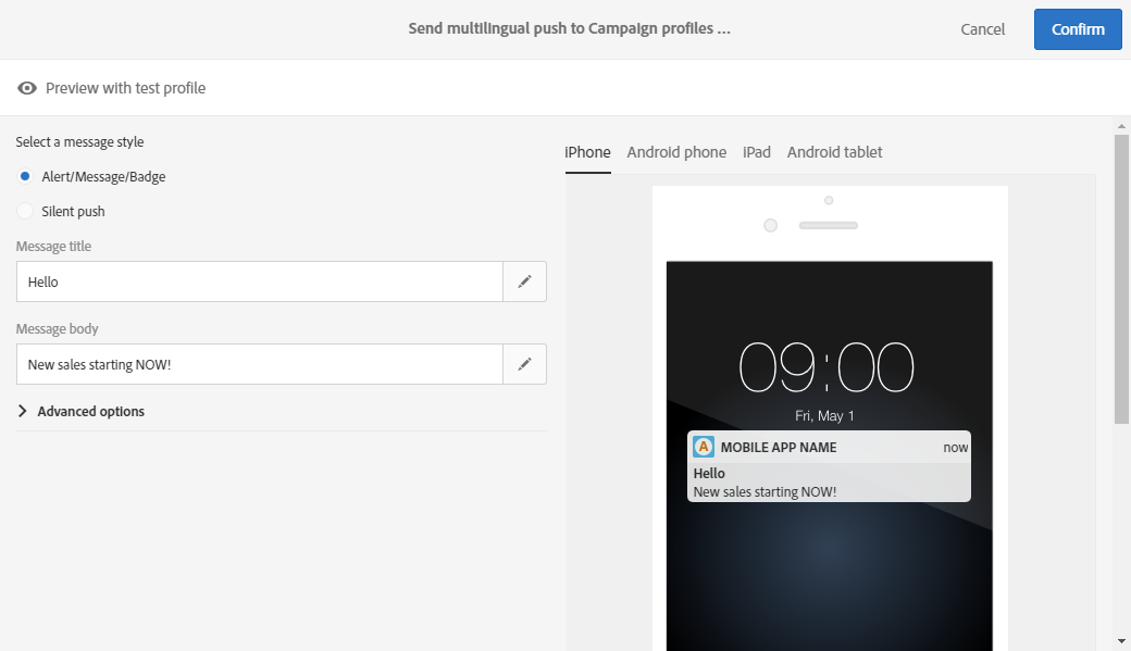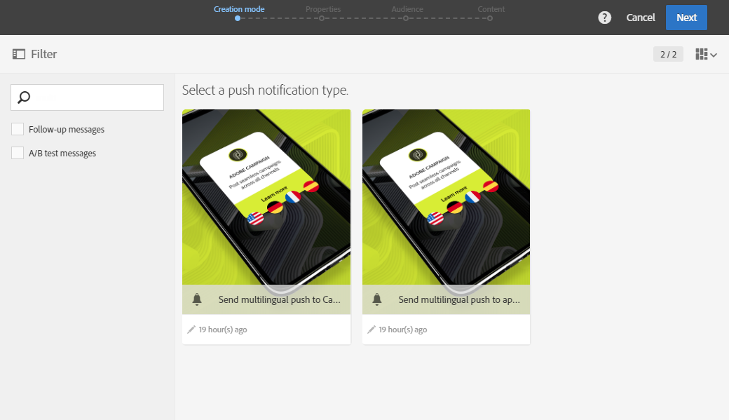 템플릿을 선택합니다 Send multilingual push to Campaign profiles 모바일 애플리케이션 또는 템플릿을 구독한 Adobe Campaign 프로필을 타겟팅하려면 Send multilingual push to app subscriber 모바일 애플리케이션에서 알림 수신을 선택한 모든 사용자에게 푸시 알림을 전송하기 위해.