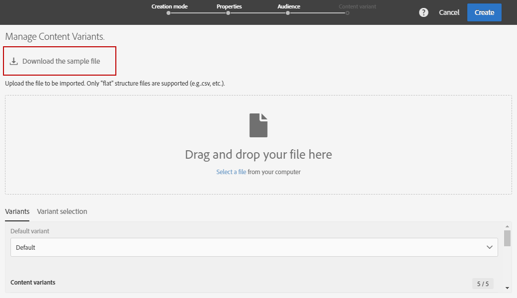 에서 Manage Content Variants 창에서 파일을 끌어다 놓거나 컴퓨터에서 파일을 선택합니다.
