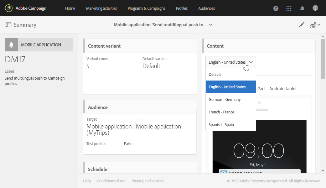 사용자의 선호 언어 및 지역에 따라 메시지를 전송하여 푸시 알림 콘텐츠를 개인화할 수 있습니다. 콘텐츠 편집기에서 다국어 푸시 알림 콘텐츠 변형을 직접 가져오고 다국어 푸시 알림을 단일 게재로 보낼 수 있습니다.