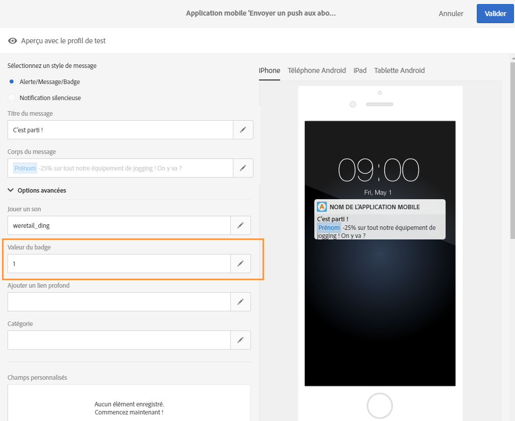Dans cet exemple, la valeur 1 a été saisie dans le champ Valeur du badge pour indiquer aux utilisateurs que l'application contient une nouvelle information.