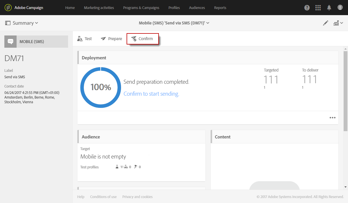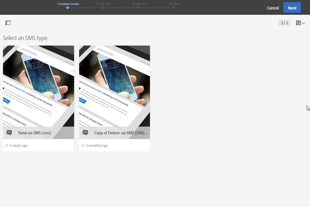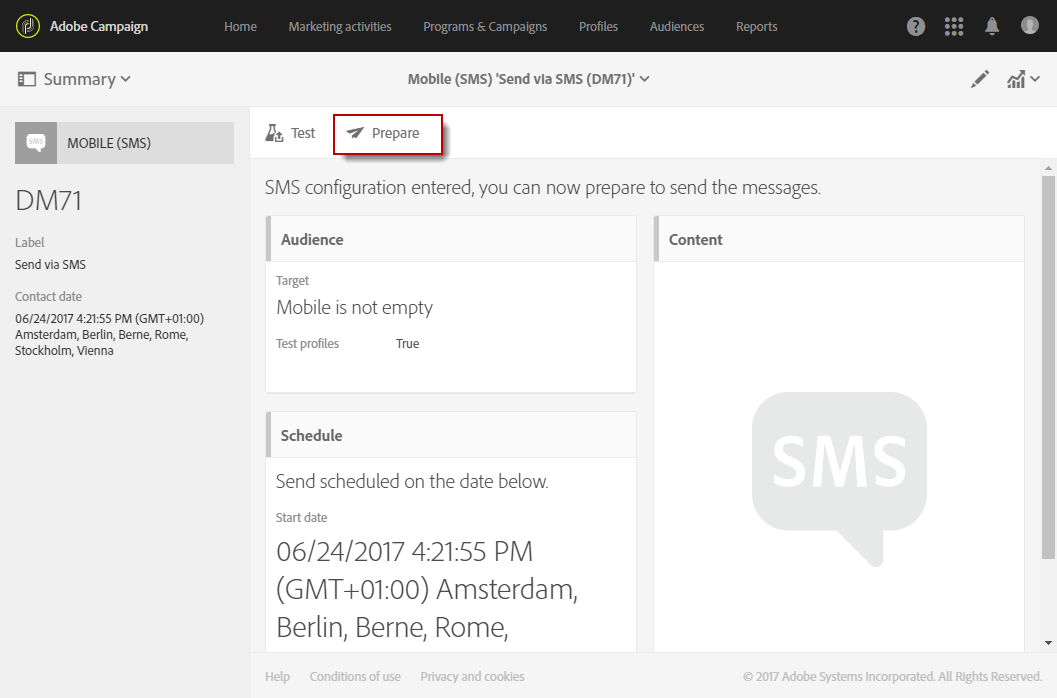SMS 게재 만들기 Adobe Campaign 홈페이지의 캠페인 또는 마케팅 활동 목록에서수행할 수 있습니다.
