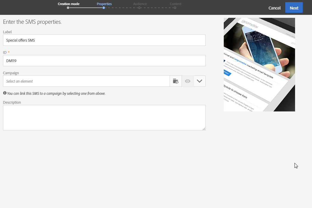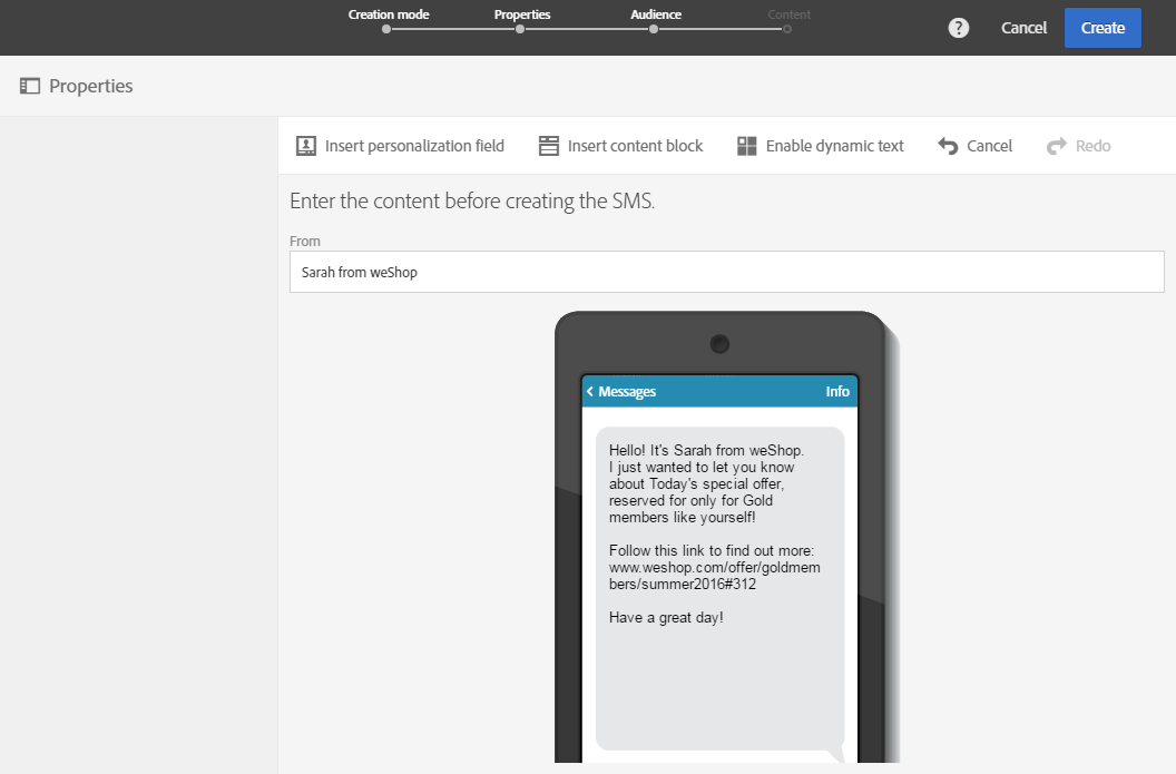 SMS에 콘텐츠를 추가합니다. SMS 만들기가 완료되면 게재 대시보드의 Content 섹션을 클릭하여 콘텐츠를 정의할 수도 있습니다. SMS 컨텐츠 디자인 정보를 참조하십시오.