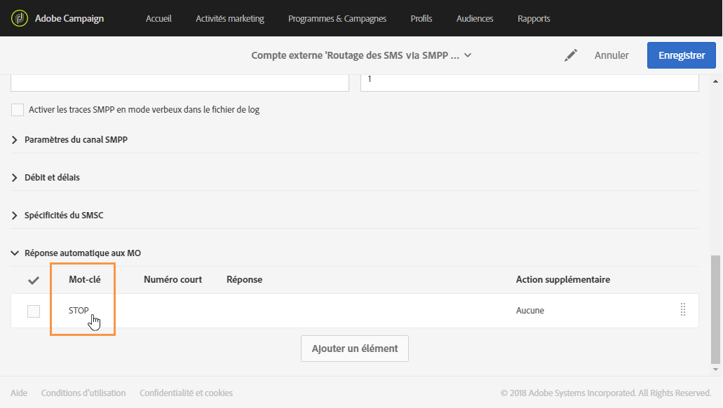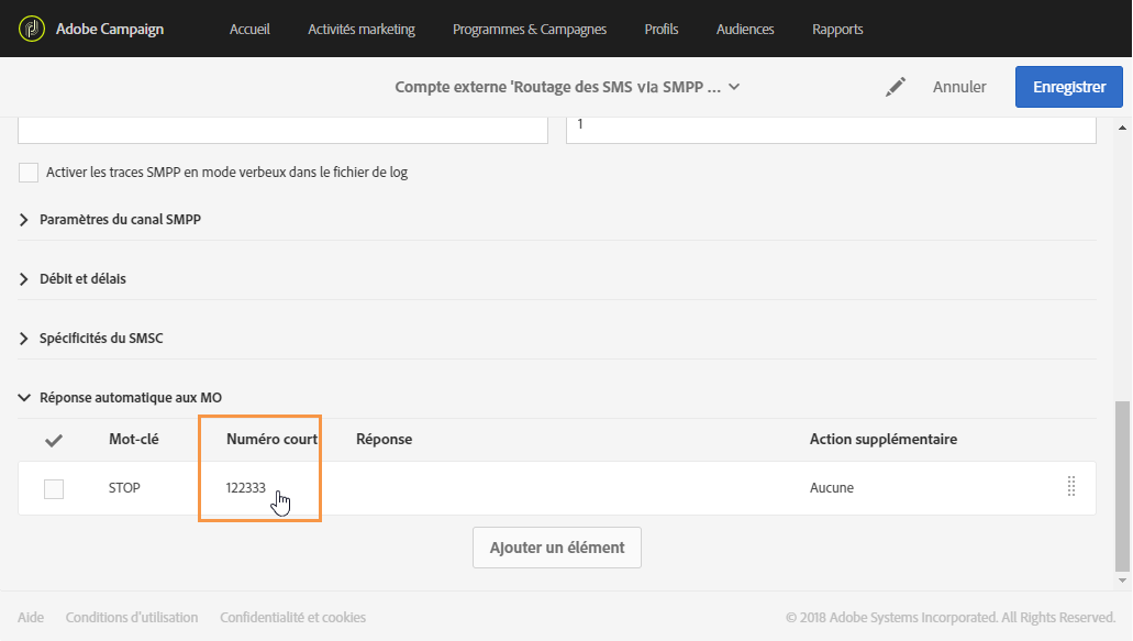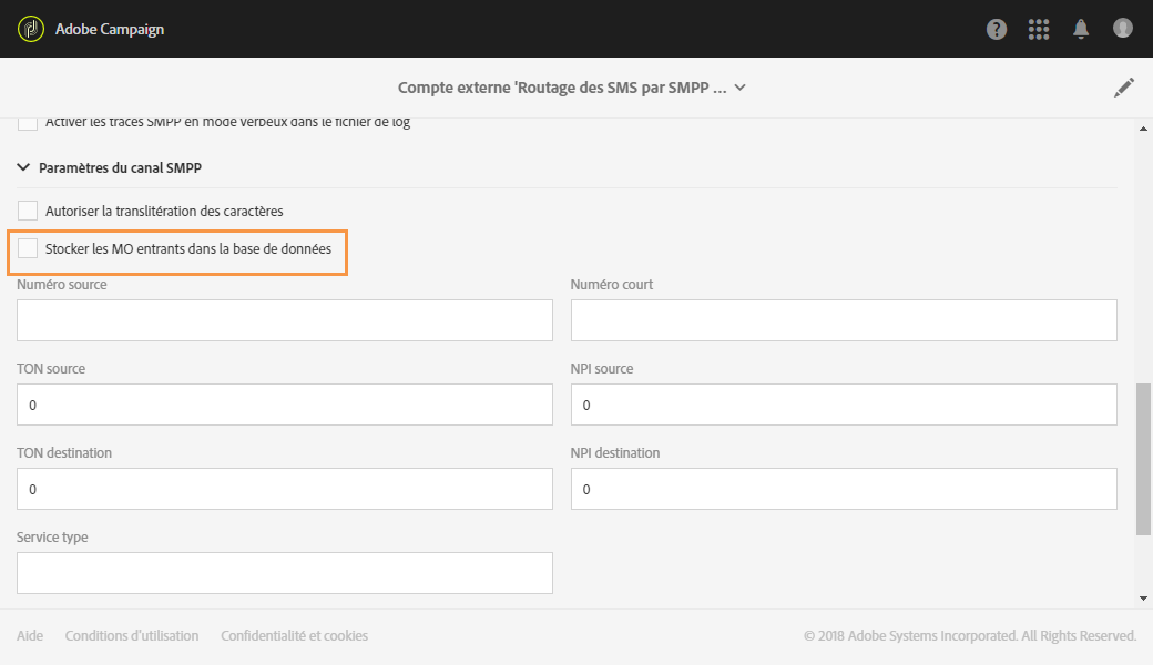 Dans le compte externe Routage des SMS par SMPP, vous pouvez choisir de stocker les messages entrants, par exemple lorsqu'un abonné répond "STOP" à un message SMS afin d'être retiré de la liste des destinataires.