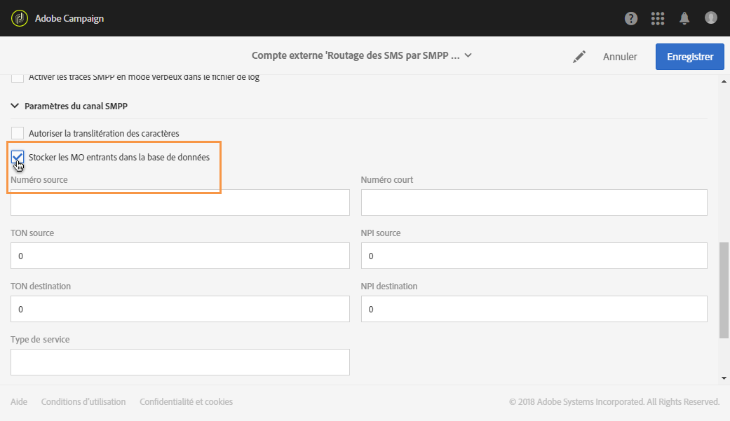 Dans le champ Paramètres du canal SMPP, cochez Stocker les MO entrants dans la base de données.