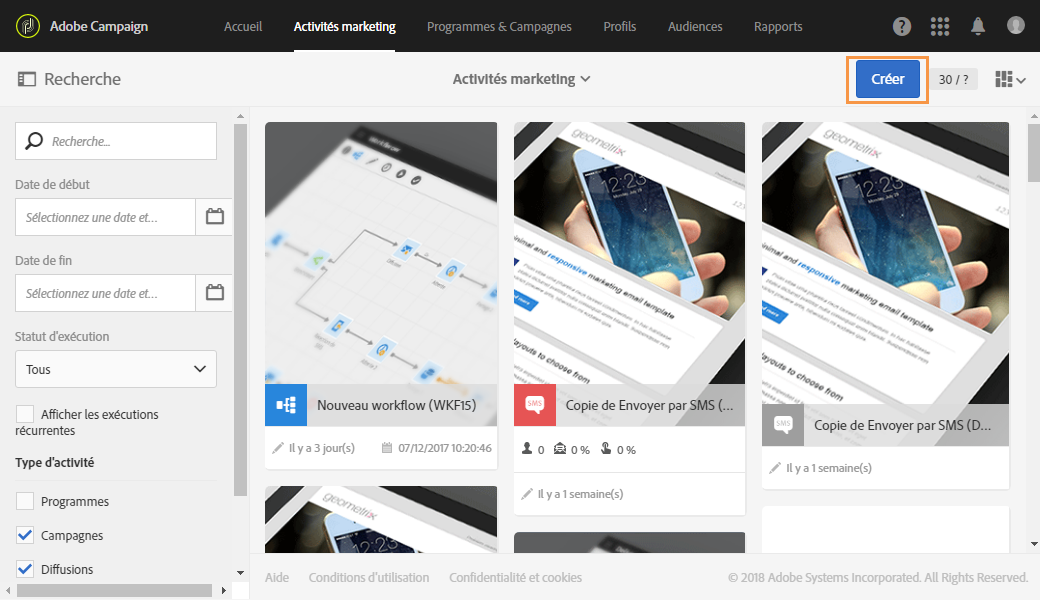 Dans l'onglet Activités marketing, cliquez sur Créer, puis sélectionnez Workflow.