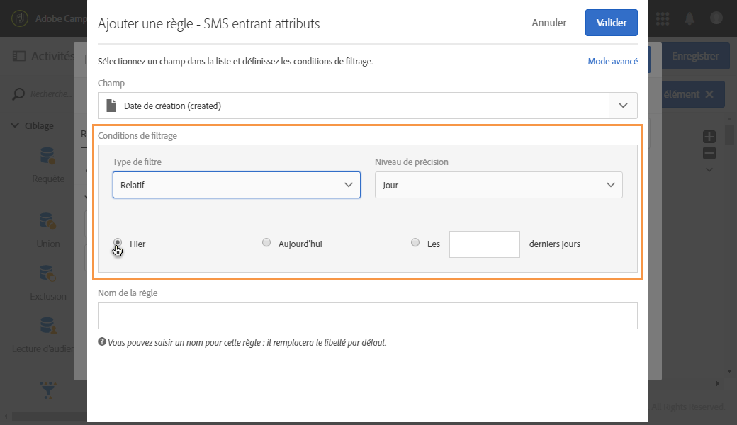 Nous voulons cibler ici chaque message entrant du jour précédent. Dans la catégorie Champ, sélectionnez Date de création (créé).
