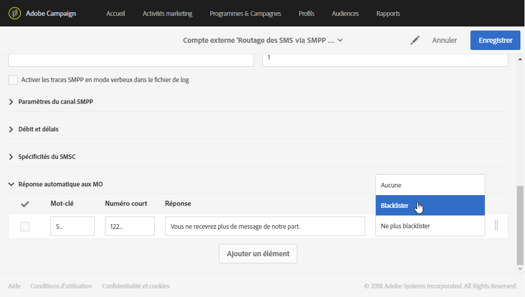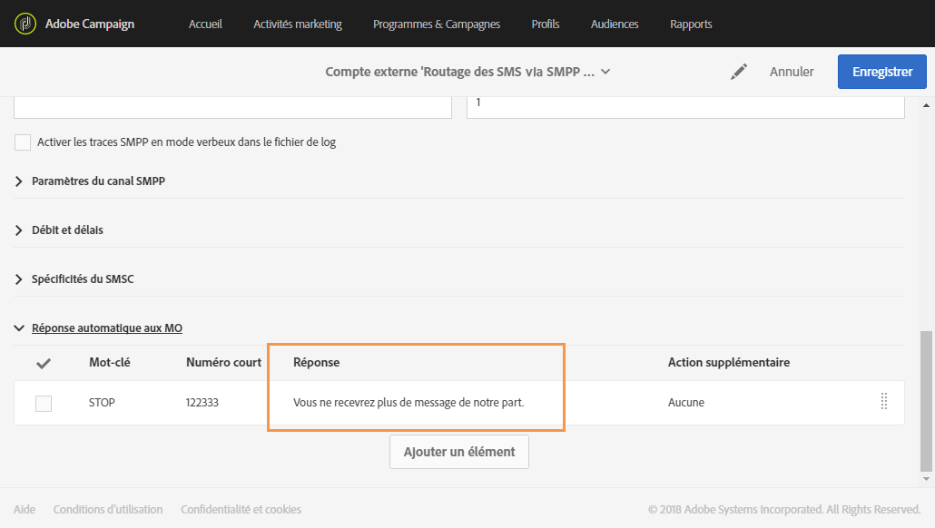 Lorsqu’un profil répond à un SMS envoyé via Campaign, vous pouvez configurer les messages qui lui sont automatiquement renvoyés, ainsi que l’action à effectuer.