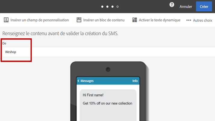 L'option De vous permet de personnaliser le nom de l'émetteur du SMS à l'aide d'une chaîne de caractères. C'est le nom qui s'affichera dans le champ correspondant à l'expéditeur du SMS sur le téléphone mobile du destinataire.