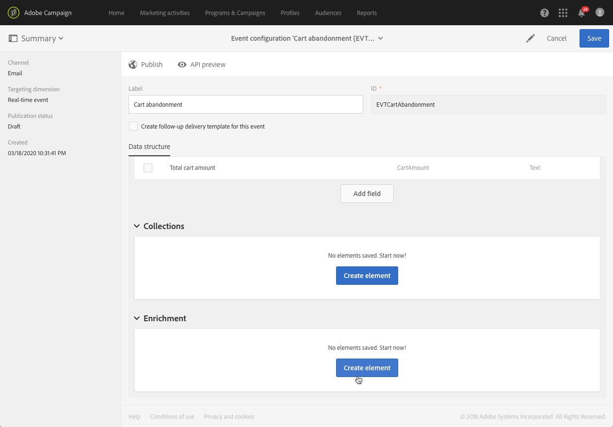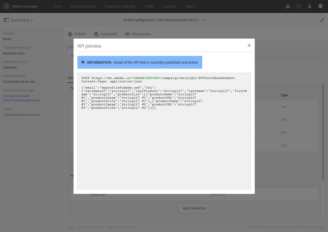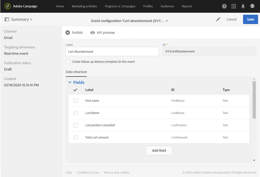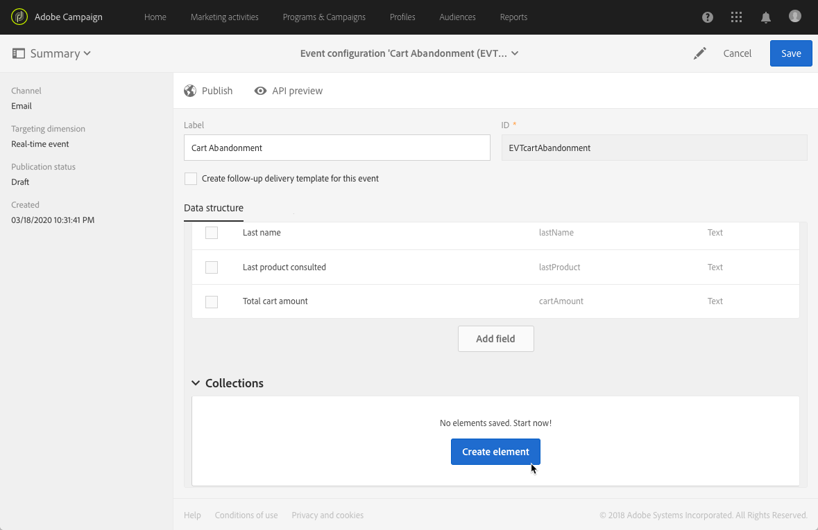 Adobe Campaign으로 트랜잭션 메시지를 보내려면 먼저 이벤트를 만들고 구성하여 이벤트 데이터의 구조를 설명해야 합니다.