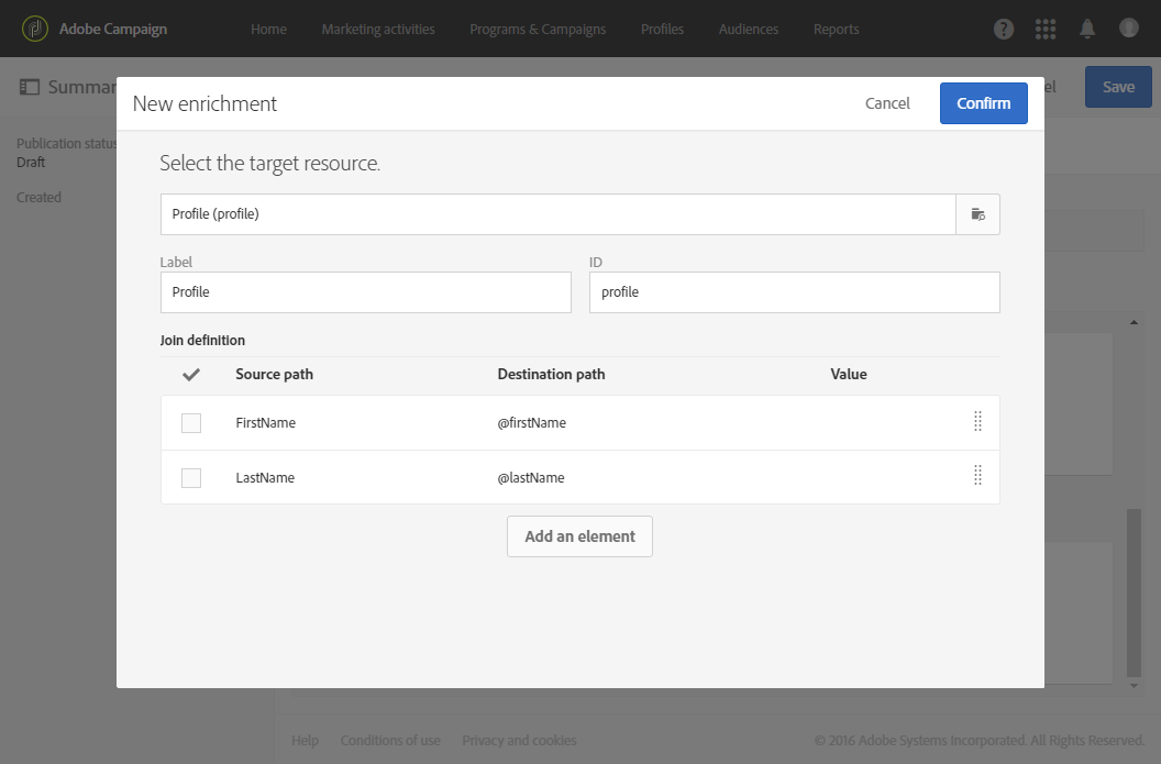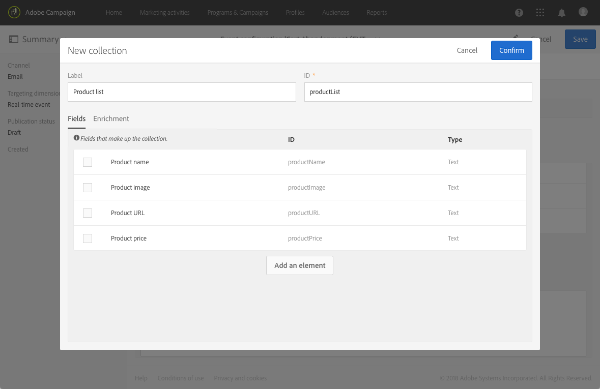 다음 Enrichment 탭에서는 컬렉션의 각 항목을 보강할 수 있습니다. 이렇게 하면 Adobe Campaign 데이터베이스 또는 만든 다른 리소스의 정보로 해당 제품 목록의 요소를 개인화할 수 있습니다.